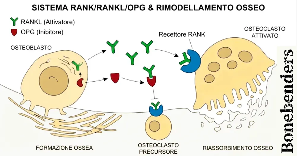 La regolazione di questi processi è passata da una visione prevalentemente sistemica, dominata dagli ormoni calciotropi classici come il Paratormone (PTH - che stimola il riassorbimento osseo per aumentare la calcemia), la Vitamina D (che regola l’assorbimento intestinale di calcio) e gli estrogeni (che inibiscono l’attività osteoclastica), a una comprensione molecolare su base locale dominata da reti di citochine localizzate. Tra queste, la triade molecolare costituita dal Recettore Attivatore del Fattore Nucleare Kappa-B (RANK - presente sulla membrana degli osteoclasti), dal suo ligando (RANKL - prodotto da osteoblasti e cellule stromali) e dal recettore “esca” Osteoprotegerina (OPG - che blocca RANKL impedendogli di legarsi a RANK) rappresenta il fulcro centrale della comunicazione paracrina tra le cellule dell’osso.