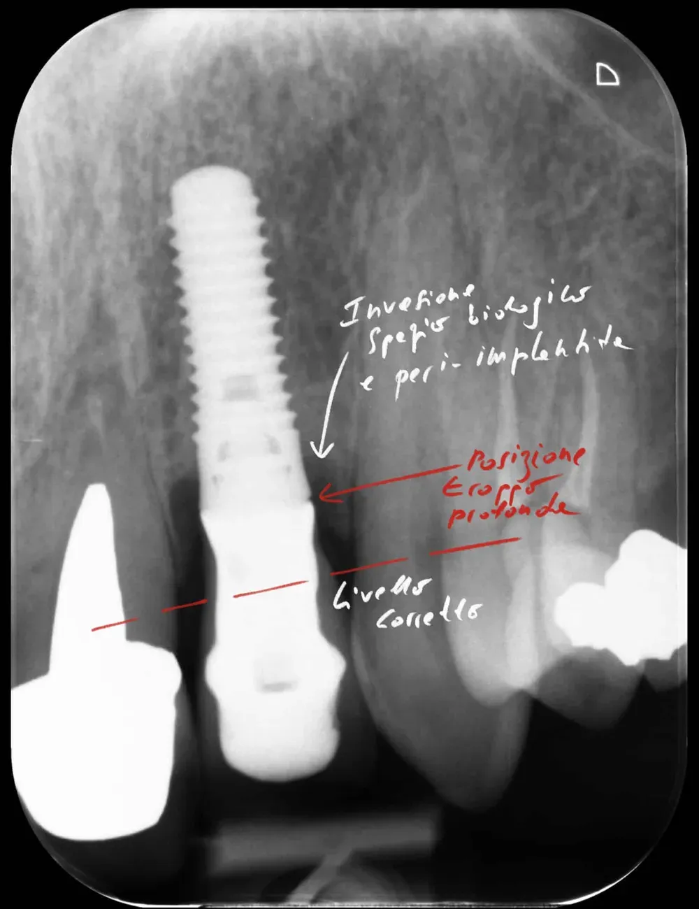 Chi ha l’occhio allenato sa che il destino di un impianto è spesso scritto già nelle radiografia post-operatoria. Si vedono i punti dove la struttura non calza. Dove le tensioni meccaniche sono eccessive. Dove il collega ha forzato con il cacciavite per fare entrare la protesi.